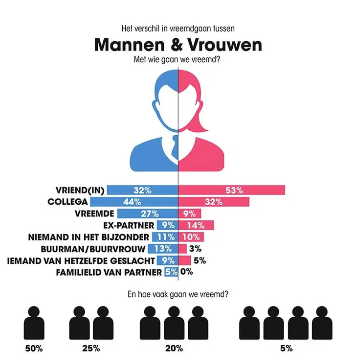 Vreemdgaan doen we evenveel, 20% van de mannen tegenover 19% van de vrouwen. Wel gaan mannen vaker vreemd. En 5% van de ondervraagden zijn wel erg druk tussen de lakens: zij hebben vijf of meer affaires gehad. You naughty ones.