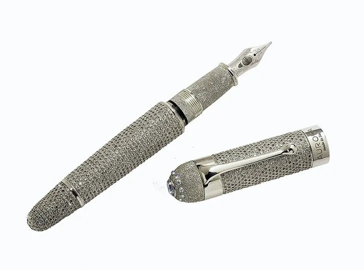 Als je ooit meer dan 5,- voor een pen hebt betaald, dan is het vast een erg speciale om belangrijke documenten te ondertekenen. De eigendomsakte van je nieuwe zomervilla op Halls Pond Cay, bijvoorbeeld. Waaronder zou je jouw krabbeltje dan zetten met dit exemplaar? De Aurora Diamante vulpen is met stip de duurste pen die je kunt krijgen. Ingelegd met diamanten en de punt is gemaakt van 18-karaats goud. Met een prijs van 1,3 miljoen euro denk je wel twee keer na voor je erop gaat kauwen.