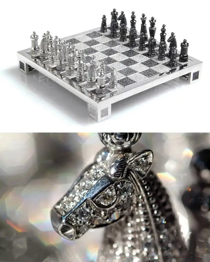 Schaken is de sport van de intellectuelen, maar nu zeker ook voor de intellectuele elite. Zolang je nog 8,8 miljoen euro op de bank hebt staan om deze set in huis te halen. De Royal Diamond Chess Set is in elkaar gezet door een team van 30 man en heeft talloze diamanten en edelstenen in de stukken verwerkt. Robijnen, smaragden, saffieren, you name it. Het is een kunstwerk dat je zou zien in de Hermitage in St. Petersburg in een extra beveiligde vitrine en niet zo gauw op een salontafel. Maar hé, als je bereid bent om dit te kopen, heb je vast ook wel het budget voor een kluis of een beveiligingsmannetje.