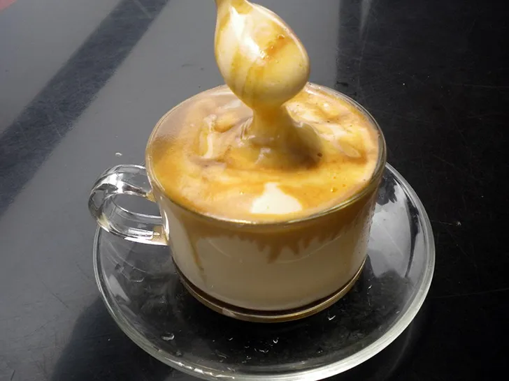 Als je in Vietnam koffie bestelt, reken er dan op dat je er eentje krijgt die voor een dessert kan doorgaan. Ca Phe Trung kun je vertalen met eierkoffie. Ze kloppen twee eidooiers met gecondenseerde melk, honing en vanille-extract stijf en gieten dit in een kopje. Dit toppen ze met zwarte Vietnamese koffie. Het eimengsel zal naar boven komen. Nu is het aan jou om het eerst eruit te lepelen of het met ei en al op te drinken.
