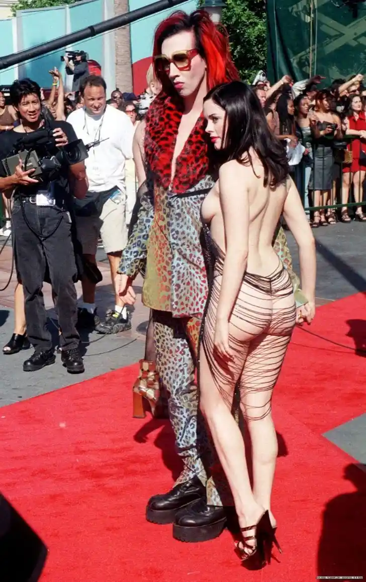 Dit is echt een gouden ouwe, zoals ze dat noemen. Terug naar 1998, toen MTV nog videoclips uitzond en de naam Video Music Awards dus nog ergens op sloeg. Rose McGowan choqueerde iedereen met deze rode loper jurk, ehhh, touwtjes.