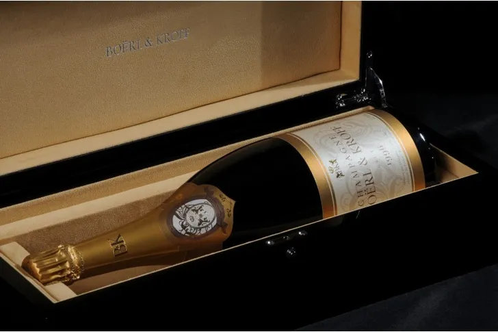 De champagne's van het noord Franse huis Krug komen normaal gesproken al met een (on)vriendelijk prijskaartje, maar deze limited edition fles stuwt de prijs richting een modaal maandsalaris. De speciale graveringen maken dit de nummer negen in de lijst van duurste poepel.