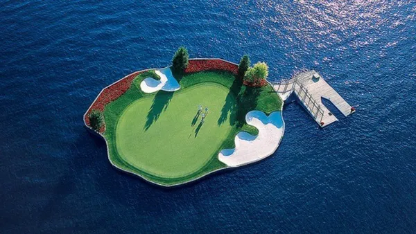 Juist, het gaat hier om een golfcourse waarvan een deel drijft. Dus: afslaan, bootje pakken en putten. Daarvoor willen we best een keer een geruite broek aantrekken.