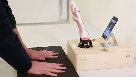 De True Love Tinder Robot bestaat uit verschillende onderdelen, waaronder een robothand, aangesloten op draden en gemonteerd op een doos met een luidspreker. De metalen mat, waar je je handen op plaatst, registreert de reacties van je lichaam, zoals spanning of zweethanden.
