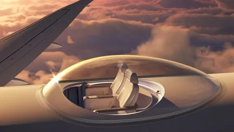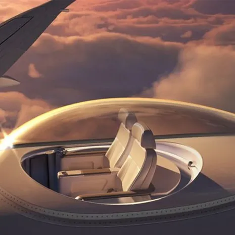 Via een glazen buis kom je in een koepel bovenop het vliegtuig te zitten, waar je vervolgens met een uitzicht van 360 graden kunt genieten van het wolkendek. Dat is nog eens vliegen in stijl.