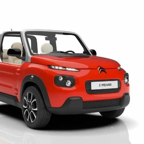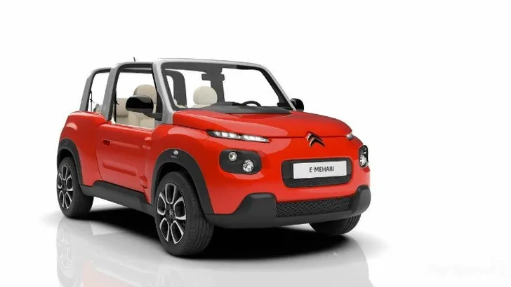 De Citroën E-Mehari, een elektrische jeep, is geïnspireerd op de originele Mehari die uitkwam in 1968, is voorzien van zonnepanelen op het dak en heeft het een volledig waterproof bekleding. Niet echt geschikt voor snelheidsduivels, maar toer je graag met een vrouw in alle rust door een ruig landschap, dan is deze bak prima te doen.