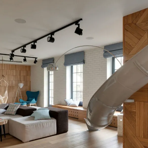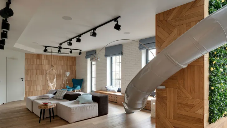 Dit appartement in het Oekraïense Charkov is een speeltuin voor een volwassenen. De eerste en de tweede verdieping zijn namelijk verbonden met een glijbaan. Dat betekent letterlijk je bed uitglijden.
