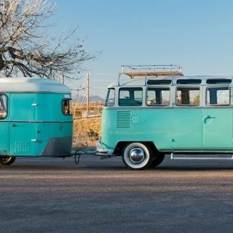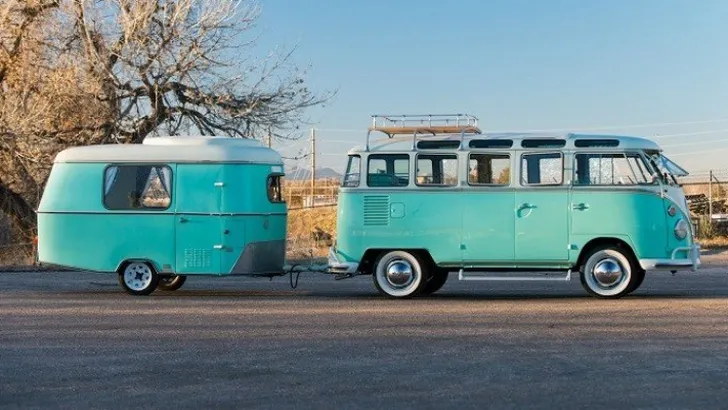 De klassieke Volkswagen Transporter type 2 wordt samen met de bijpassende caravan van Eriba Puck uit 1967 geveild. Het busje werd in 1964 gloednieuw verkocht aan een groepje vroege hippies uit San Francisco, die het voertuig niet veel later als schoolbus doorverkochten aan een privéschool voor dames in Kansas City.