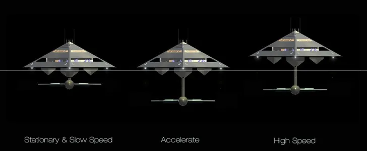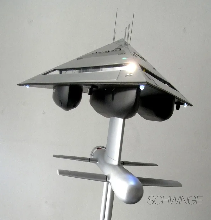 Het 'Schwinge Hyswas Tetrahedron Superyacht' ziet er onlogisch uit, maar het gevaarte zit qua opbouw geniaal in elkaar. De romp bestaat uit een torpedo, die onderwater het zware werk doet. De piramide zit er via een metersdikke pilaar op bevestigd, waardoor het lijkt alsof je over het water zweeft.