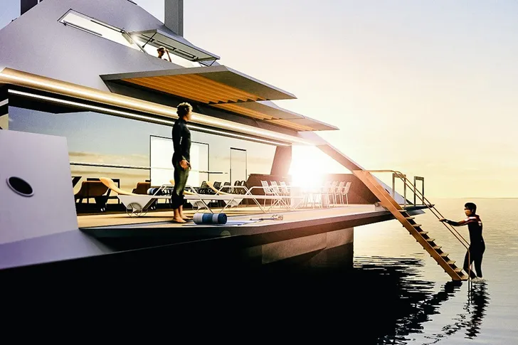 Bij hoge snelheden krijgt de torpedo hulp van twee extra motoren. En bij stilstand en lage snelheden kan er een complet dek worden uitgeklapt, zodat je in alle rust kunt zonnebaden en zwemmen.