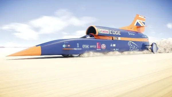 In Cornwall gaat de Bloodhound slechts 321 kilometer per uur klokken, om op te warmen. Vervolgens wordt hij verscheept naar Zuid-Afrika voor verdere testen en om en passant 1275km/u te gaan (het wereldrecord keihard rijden op land is 1223.65 km/h). Het is allemaal een opmaat naar 2017, wanneer de Bloudhound de 1000 mijl per uur (1609,34 km/h) wil halen. Nice!