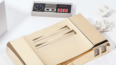 Je ziet het goed, dit is een good old Nintendo 8-bit (NES) van aluminium, verguld met een laagje 24-karaats goud. De officiële benaming van deze console is de Analoge NT 24k Gold. Naast de mogelijkheid om NES-games te spelen, leest de console ook games van Famico en Famicon Disk System. De laatstgenoemde is vooral relevant, te weten dat The Legend of Zelda voor het eerst uitkam op deze console.