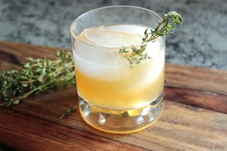 Methode: shake Glas: rocksglas Garnering: citroenschijfje en takje verse tijm