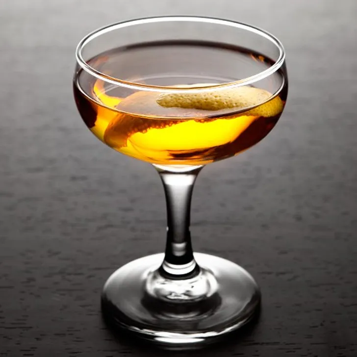Methode: stir Glas: coupe Garnering: sinaas appelzest