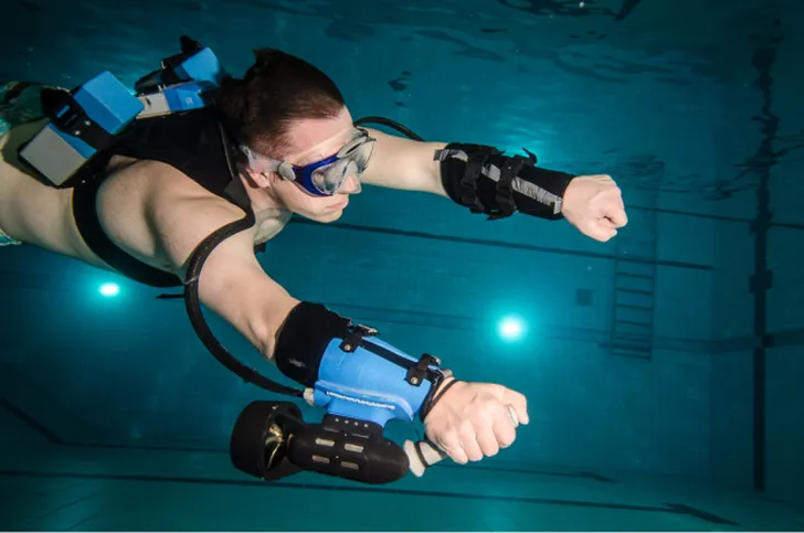 Deze jetpack zit niet op je rug, maar om je polsen. Je verplaatst je door het water. Je zult er dus nog wel wat snorkel- of duik- uitrusting bij moeten hebben. De Sport Underwater Jetpack is hier te koop.