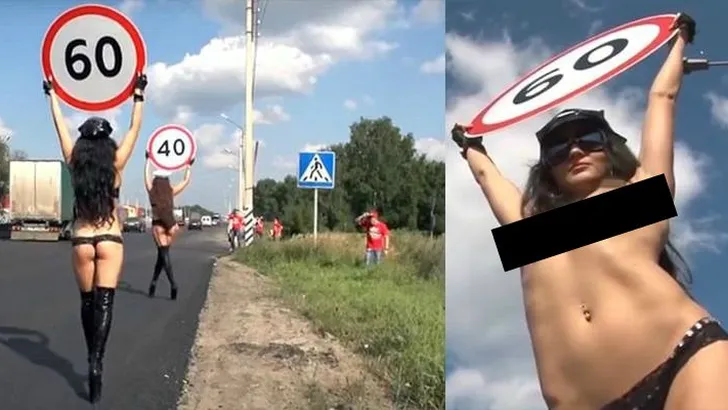 Waarom hebben wij dit nog niet? In Rusland worden topless vrouwen langs de weg gezet om het verkeer langzamer te laten rijden.