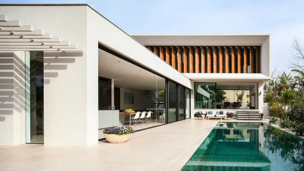 Voor deze villa zou je spontaan naar Tel Aviv verhuizen. Dit L-vormige huis is om het zwembad heen gebouwd waardoor dit het kernpunt van de woning is. Het interieur en exterieur gaan naadloos in elkaar over. Design van de bovenste plank.