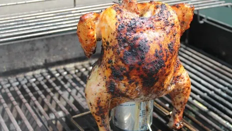 Injecteer de kippen met bier in borst en dijen. Verwarm het bierblik op het vuur zodat het zeker goed verdampt als de kip erop zit. Wrijf ondertussen de kip volledig in met de kipmixrub. Als het bier bijna kookt in blik, schuif dan de kip erover. Trek de twee poten uit zodat ze samen met het bierblik een driepoot vormen op het rooster. Als de kip op het vuur staat, gooi dan regelmatig wat rozemarijn in het vuur voor een kruidige rooksmaak. Gaar de kip ongeveer één uur tot een kerntemperatuur van 70 graden Celsius voor de borst en 75 graden voor de dijen.