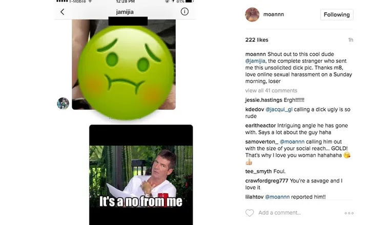 Australisch model Simone Holtznagel stond in oktober 2015 op de cover van de college-issue van Playboy en werd daarna ook aardig populair op Instagram. Ze ontvangt zo nu en dan ook dickpics en vond het genoeg geweest. De laatste vent die haar een dickpic stuurde ging rechtstreeks richting de schandpaal. Ze plaatste de betreffende foto met een misselijke emoticon op haar Instagram, onder de foto stond een meme van Simon Cowell met de tekst: ''It's a no from me,'' duidelijke taal. De naam van de dickpic kerel siert in de post dus alle 71.000 volgers konden zien wat voor pannenkoek hij is, en daar werd dan ook naar gereageerd. Instagram heeft Simone inmiddels gedwongen de afbeelding offline te halen.