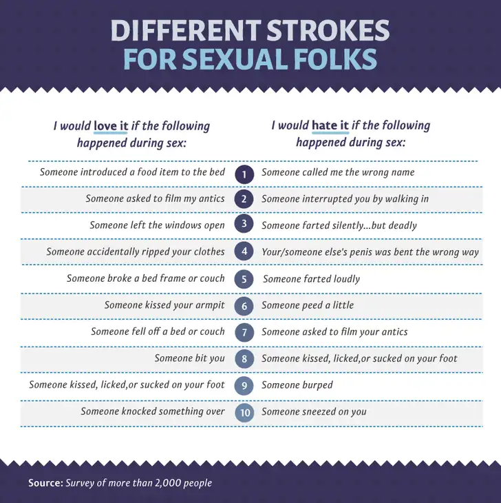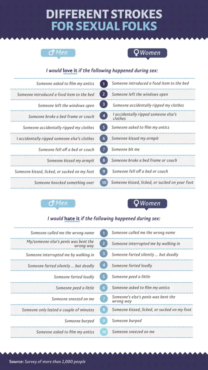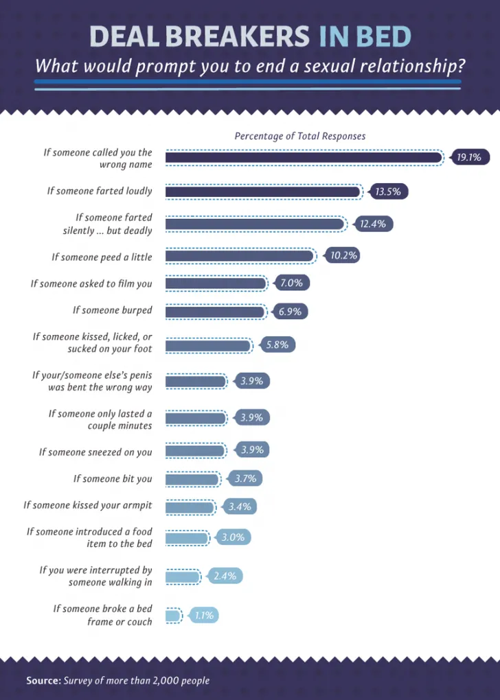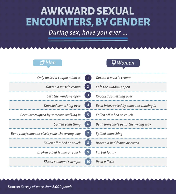 8. Bijna 4% van de mensen vond een van de volgende zaken gênant: een boer laten, gevraagd worden of de daad vereeuwigd kon worden op film, of de mix van eten en sex