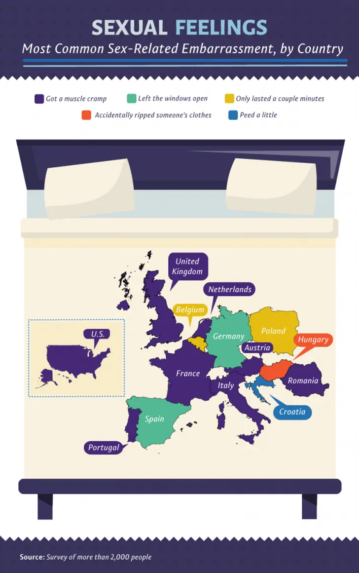 In Nederland vinden we het het kutst om kramp te krijgen tijdens de sex. Engeland, Frankrijk, Italië, Portugal, Hongarije, de VS en Oostenrijk delen die mening.