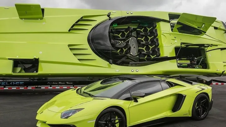De veiling duurt nog maar vijf dagen dus haast is geboden, momenteel staat het hoogste bod op 2,195 miljoen dollar. Wat krijg je dan voor die prijs? Een gifgroene, om precies te zijn de custom-made kleur Verde Singh, Aventador SV Roadster uit 2016 met 700 mijl ( ongeveer 1100 kilometer) op de teller. Daarnaast krijg je de bijpassende MTI 52' Super Veloce (betekent super snel in het Italiaans) wat één van de snelste boten ter wereld is. Natuurlijk is ook de boot gespoten in de kleur Verde Singh en heeft het daarnaast nog enkele op maat gemaakte aanpassingen om de boot zo veel mogelijk op een Aventador te laten lijken. De kosten van het overspuiten van de boot met dit speciale kleurtje bedragen maar liefst 80.000 dollar. Ten slotte bevat de boot een geluidssysteem met een prijskaartje van 25.000 dollar. Gegarandeerd festa op deze boot dus.