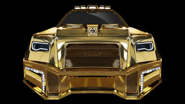 Onder de motorkap tref je een 5.5 liter V8 aan die garant moet staan voor een vermogen van minimaal 700 pk. Daarnaast komt er geen kogel binnen want de bodykit bestaat voor een groot deel uit kevlar (dat zit ook in kogelvrije vesten). Het interieur bestaat uit alligatorleer wat een prijskaartje van 30.000 dollar heeft. Het hoogtepuntje van dit stukje kitsch is het stuur, daar tref je twee robijnen en 292 diamanten op aan. Hoeveel de wagen kost is niet bekend gemaakt.