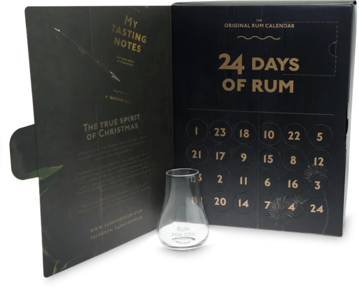 Deze kalender is gevult met 24 verschillende flesjes rum, samengesteld door 1423 World Class Spirits. De flesjes hebben een inhoud van 2 cl en op het flesje staat waar het vandaan komt.