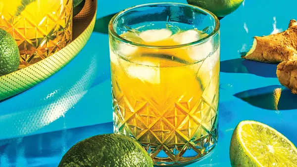 Stop de gemberplakjes in een cocktailshaker. Voeg Mekhong, limoensap, siroop en ijs toe. Schud en schenk in een tumbler. Garneer met een partje limoen. Chok dee!