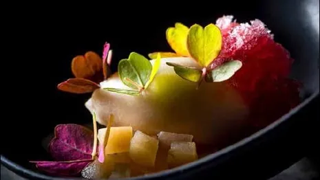 ‘Dit dessertje creëerde ik met het idee van een cocktail in mijn achterhoofd. Zo ben ik een gigantische fan van mezcal in cocktails en in combinatie met de weer opkomende populariteit van de negroni, begon ik te zoeken naar een smaakprofiel dat het herfstgevoel van het appelseizoen droeg. Voor dit gerechtje snijden we jonagoldappels in plakken, macereren we het fruit een nacht in onderstaande marinade en na een dag laten we het anderhalf uur in de vacuümzak met de marinade stomen op 75°C. Nadat de appels afgekoeld zijn, roosteren we ze in een houtoven annex barbecue tot ze supersmaakvol zijn. Voor het dresseren versnijden we de geroosterde appel tot een brunoise en serveren hem als salade met een frisse sorbet van verse jonagold, granité van mezcalnegroni en een saus op basis van citroenmousseline met karnemelk en kaneel. De salade werken we af met mooie oxalisblaadjes en de warme saus. Zowel superfris als rokerig, zoals ook een lekkere cocktail kan smaken.’