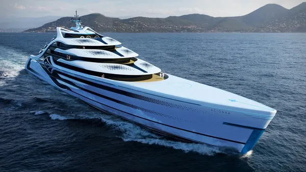 Maak kennis met de Acionna Superjacht. De overmaatse aard van het Acionna Superjacht Concept, met een lengte van 144 meter met acht dekken, benadrukt graag zijn eco-bewuste intenties. Dit jacht wordt aangedreven door waterstof, met behulp van een systeem dat lijkt op een systeem dat momenteel wordt getest in cruiseschepen en veerboten. Om ervoor te zorgen dat er veel te doen is op uw reis over zee, biedt het interieur voldoende ruimte voor een squashbaan, een helikopter hangar en een overdekt zwembad. Buiten zijn er nog wat zwembaden te vinden, mocht je willen genieten van het zonnetje.